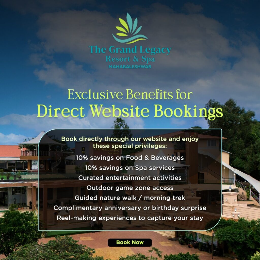 Feel the fresh mountain air and marvel at the vibrant landscapes of Mahabaleshwar, set amidst the majestic Western Ghats. Known for its panoramic views, strawberry fields, and serene lakes, This hill station promises the perfect escape. Enjoy a memorable stay at The Grand Legacy Resort and Spa, an award-winning resort with 13 distinct accommodations, exceptional dining options, a pool for leisurely swims, multiple event venues and a wealth of exciting indoor and outdoor activities. Reflecting the town’s natural beauty, our resort in Mahabaleshwar offers the perfect blend of relaxation and adventure, making every stay a memorable experience.